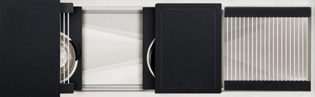 Our matte black Graphite Wood Composite material perfectly complements a contemporary, transitional, or traditional kitchen design and looks wonderful with a wide range of cabinet and countertop colors. This high-performance, dense material is only ½ inch thick, is gentle on your knives, and is easy to clean in the Workstation or in the dishwasher.