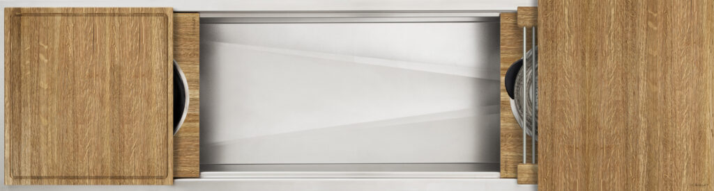 Our matte black Graphite Wood Composite material perfectly complements a contemporary, transitional, or traditional kitchen design and looks wonderful with a wide range of cabinet and countertop colors. This high-performance, dense material is only ½ inch thick, is gentle on your knives, and is easy to clean in the Workstation or in the dishwasher.